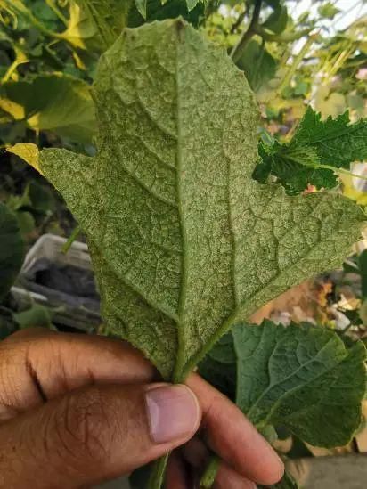 二斑葉螨主要為害上部嫩葉,使葉片呈淡黃色斑或白色,嚴(yán)重影響葉片光合作用,受害的葉片背面有灰褐色的油狀光澤,葉片僵硬,畸形生長,表現(xiàn)癥狀與病毒病、激素中毒狀類似。