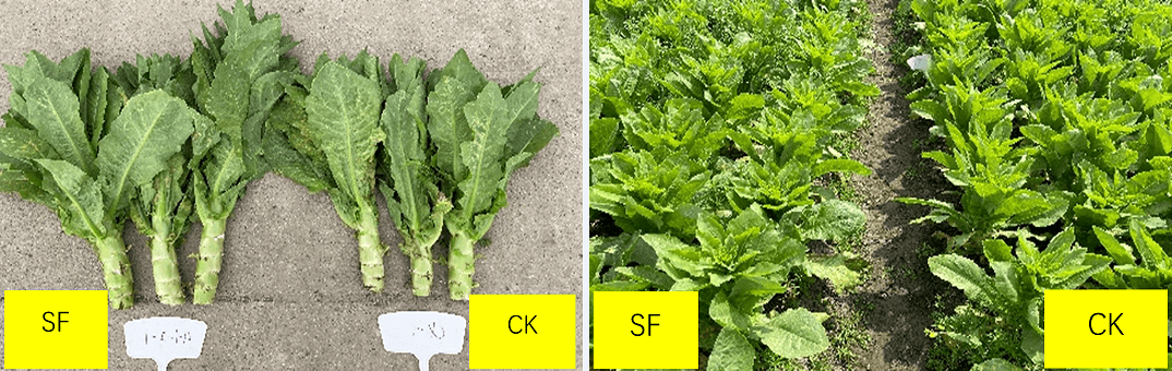 (1)花粉多糖復(fù)配水溶肥提效增產(chǎn)。在水溶肥中添加5-10kg/t花粉多糖,可促進(jìn)小白菜光合作用,顯著提高葉綠素含量10.97%,促進(jìn)小白菜葉片生長(zhǎng),地上部生物量增加34.0%-41.78%;同時(shí),水溶肥復(fù)配花粉多糖,能提高小白菜的營(yíng)養(yǎng)品質(zhì),促進(jìn)葉片Vc含量及可溶性糖含量積累。